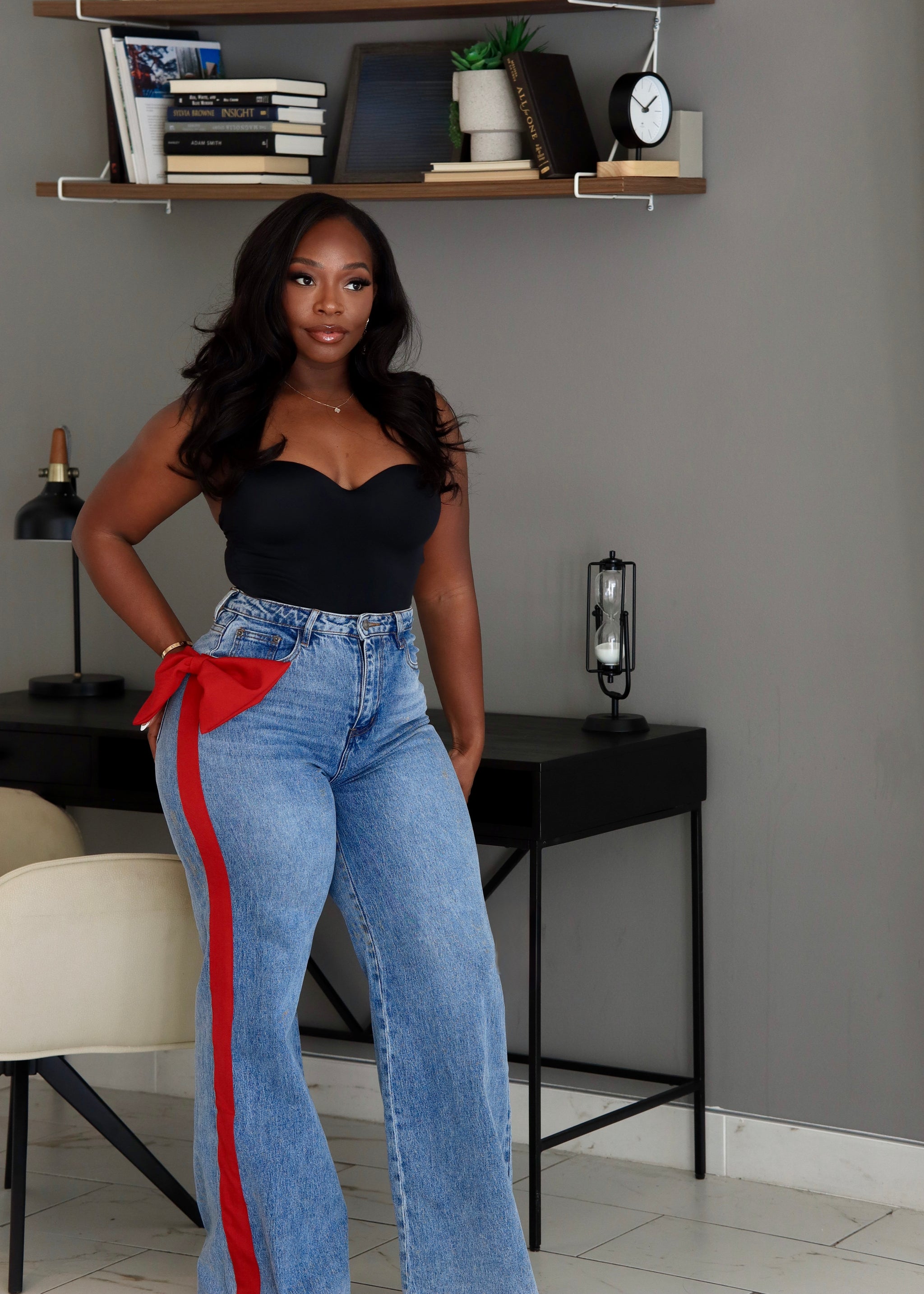 The Cutest Bow Jeans bring a playful twist to classic denim. A soft straight leg silhouette is paired with a bold red bow and matching side panel that instantly elevates your look without trying too hard. Feminine, fun, and easy to style, this pair turns a simple outfit into something worth a double take. The kind of denim that makes your top half work a little less.